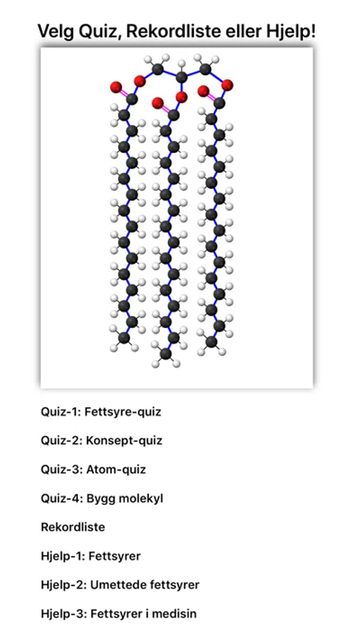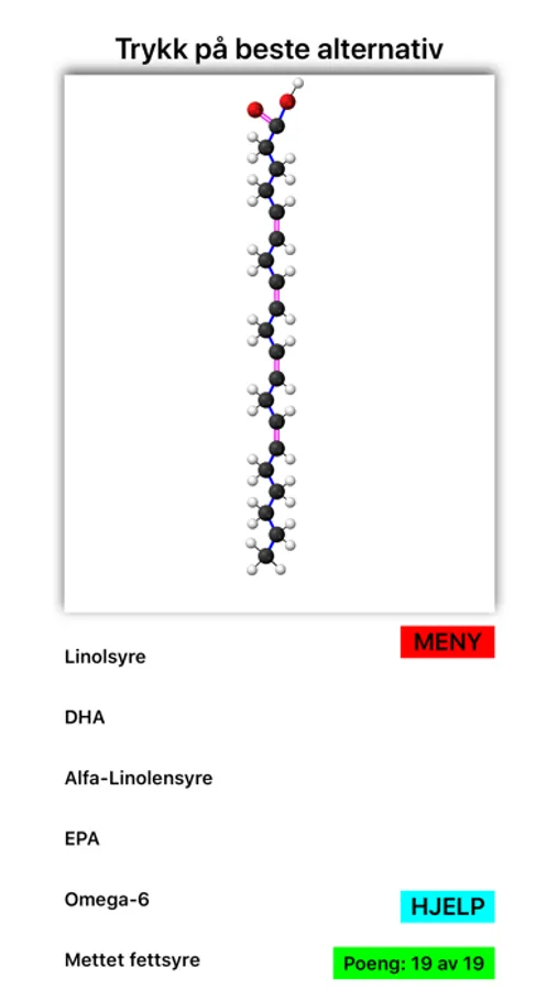 Fettsyrer på Norsk er en biokjemi quiz app som lærer deg hvordan fett er bygd opp av fettsyrer, hvordan fettsyrers struktur er og hvordan fettsyrer kan endres til signalstoff i hjernen og i immunforsvaret.