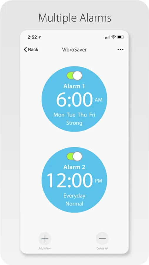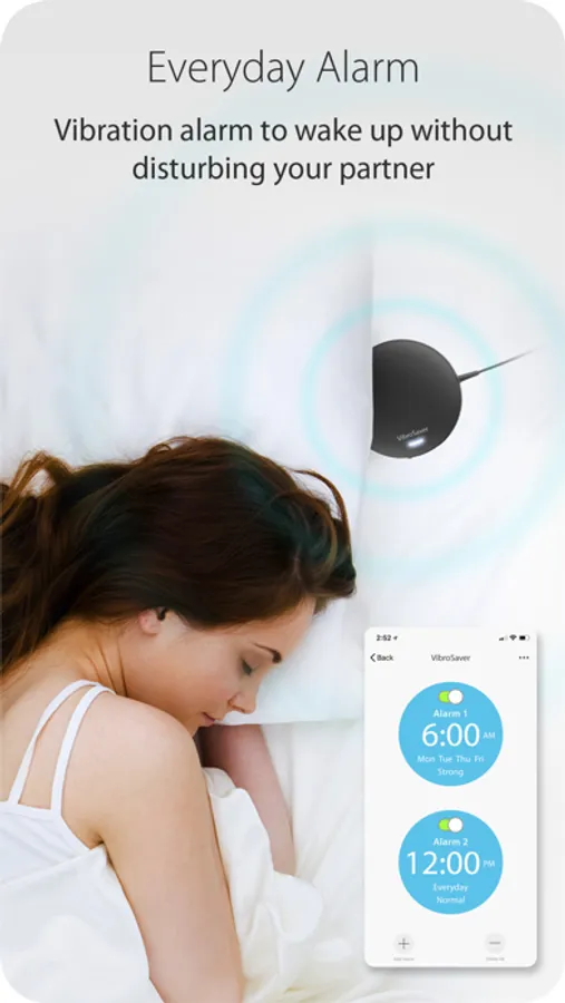 In the VibroSaver app, create multiple alarms, select vibration level of normal or strong, and set weekdays or weekend. VibroSaver will work even when your phone is not connected or the phone's battery dies. Never worry about the battery power since it runs on AC power with included AC power adapter.