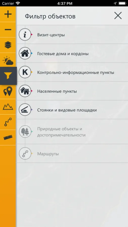 Позволяет ознакомиться с месторасположением: вершин гор, стоянок для отдыха, приютов, проложенных маршрутов.