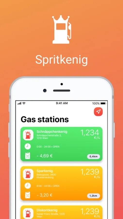 With the Spritkenig app you can find the cheapest gas stations near you. This will give you the best prices and can help you save money!