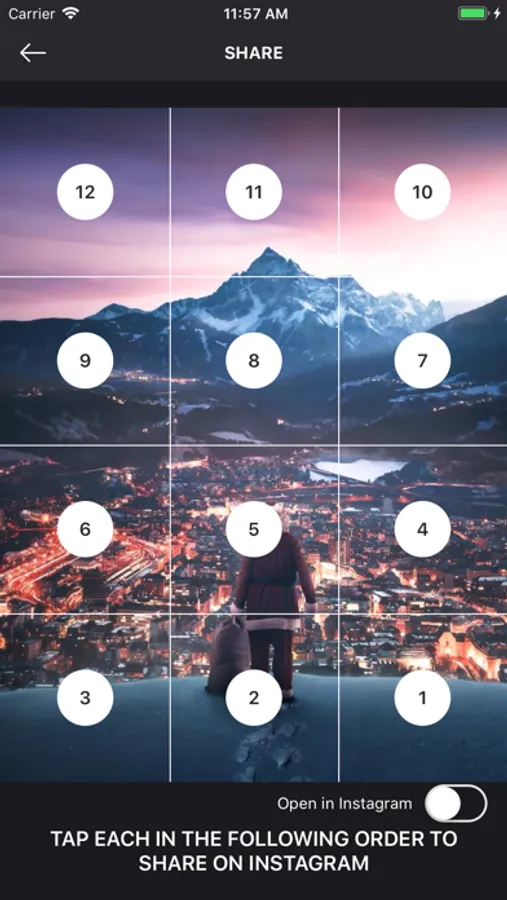 Upload an image from your Library and let Grids crop the image for you! All you have to do is to submit the resulting pics to your Instagram in the order suggested by the app. You don't even have to save the tiles to your device as sharing to Instagram is embedded in the application!