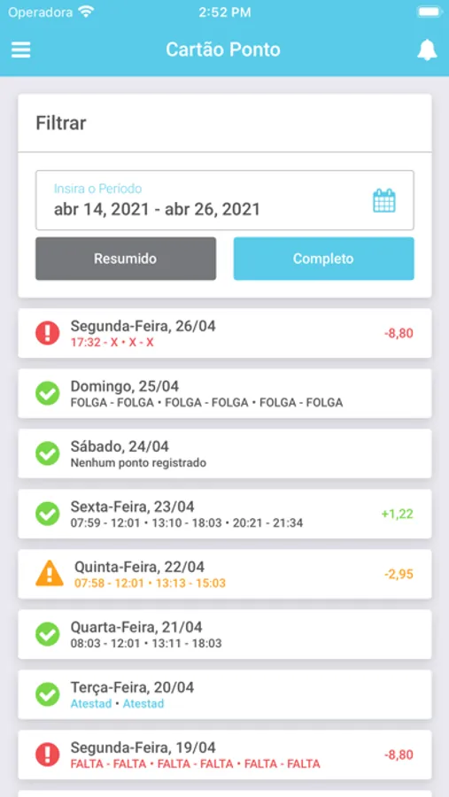 • Possui indicadores com o saldo do banco de horas, horas extras e faltantes;