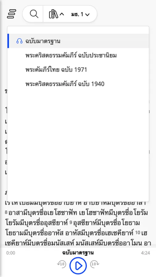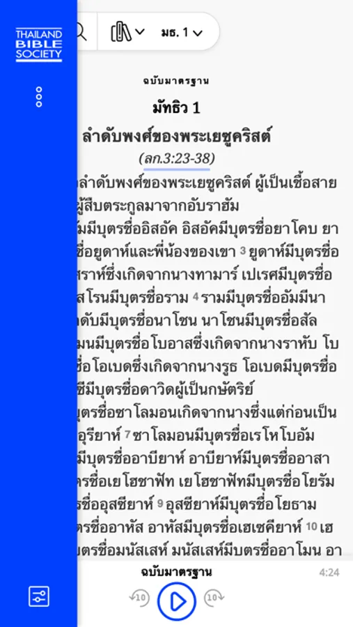 แอพลิเคชั่นนี้เป็นของสมาคมพระคริสตธรรมไทย ประกอบไปด้วยพระคริสตธรรมคัมภีร์ไทย ฉบับมาตรฐาน ฉบับ 1971 และฉบับ 1940 โดยจัดทำขึ้นเพื่อให้คนไทยสามารถอ่านและแบ่งปันพระวจนะของพระเจ้าได้ทุกที่ ทุกเวลา
