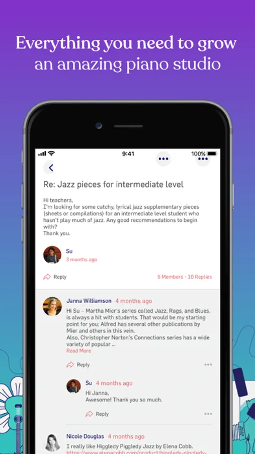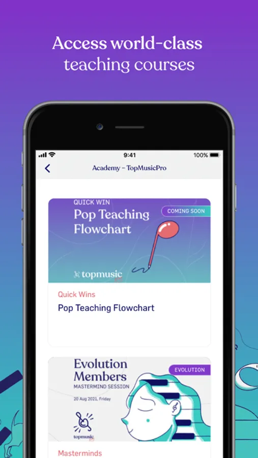 The TopMusicPro app allows music teachers access to member resources including courses, workshops, downloads and training while at the same time asking questions in the forums, and connect with other members through our in-app messaging.