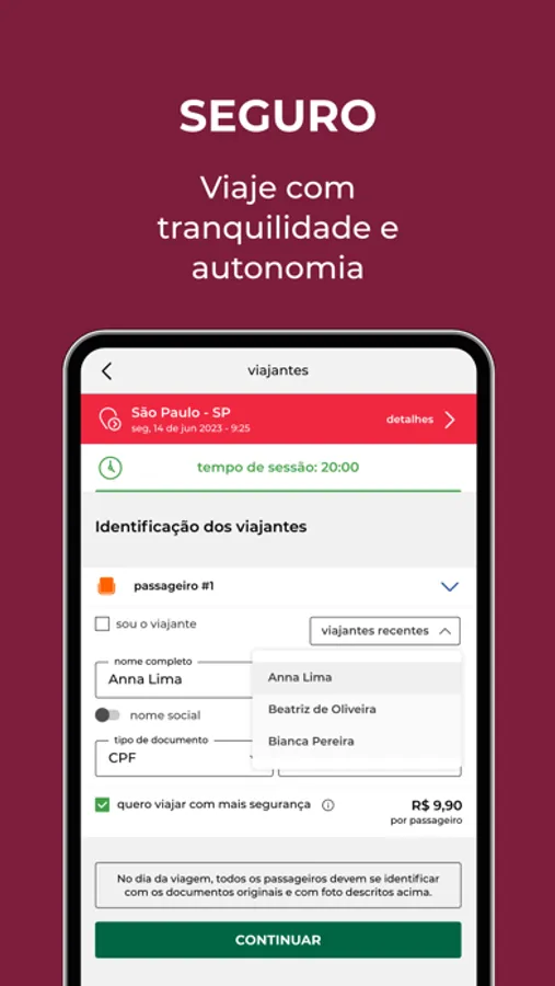 Depois de ter o destino perfeito e a viação escolhidos, preencha as informações de identificação. Aliás, a DeÔnibus conta com um campo de Nome Social para que nossos viajantes tenham uma experiência única de conforto e cuidado.