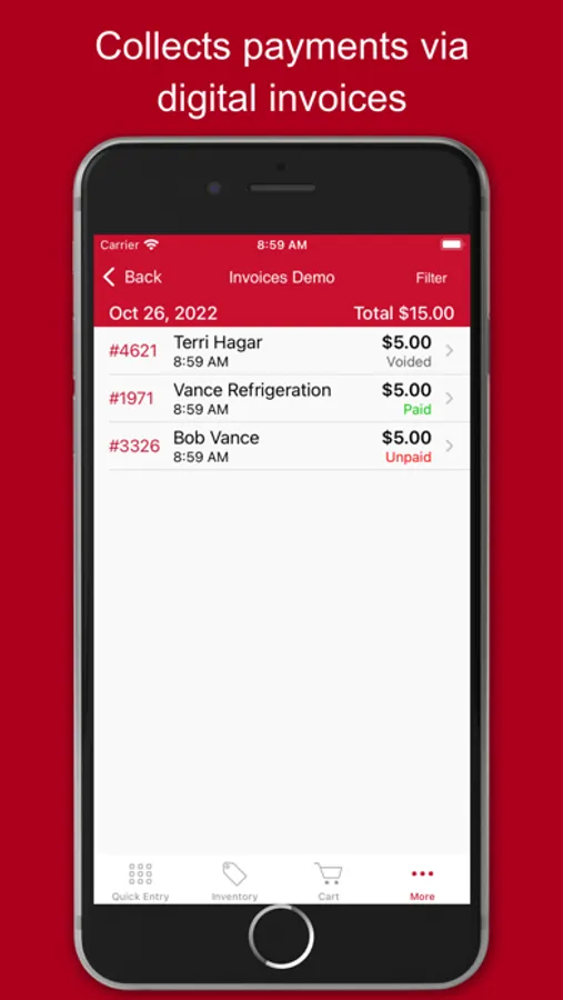 • Digital Invoices - Deliver invoices via SMS or email to customers who can pay from any mobile device or desktop computer anywhere