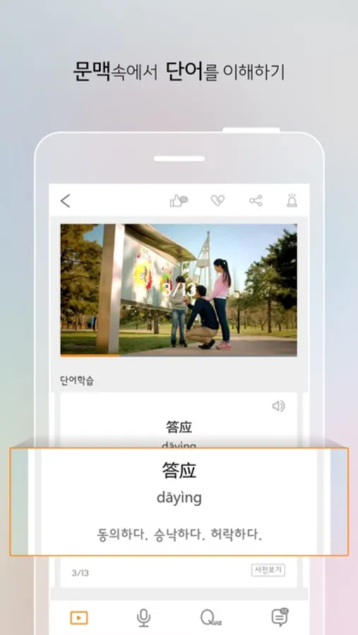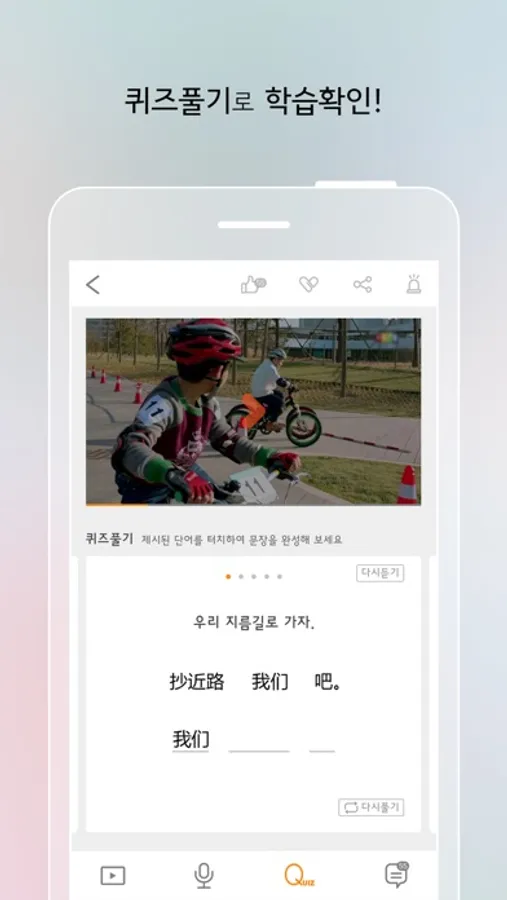 어학 능력 향상을 위해선 꾸준한 학습이 가장 중요하기에 가볍게 듣고 따라 할 수 있는 재미있는 영상들로만 준비했습니다. 중국어단어, 중국어어휘, 중국어문장 그리고 상황에 적절한 중국어회화 및 표현들을 배울 수 있습니다. 오늘부터라도 부담 없이 듣고, 따라해 보세요.