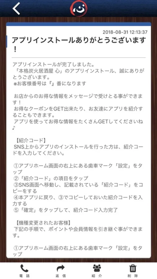 居酒屋心のアプリをSNSを通じてお友達に紹介する事ができます。