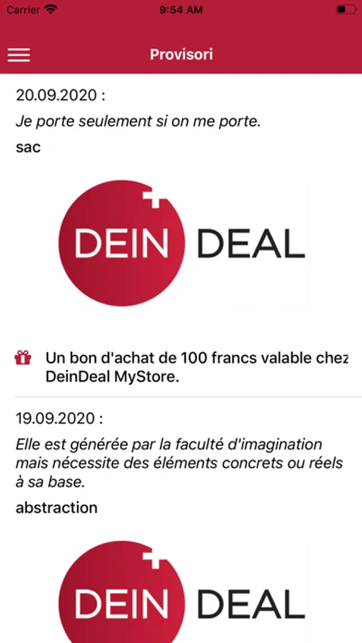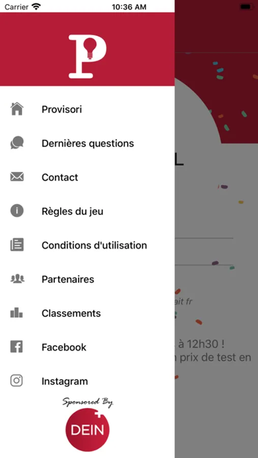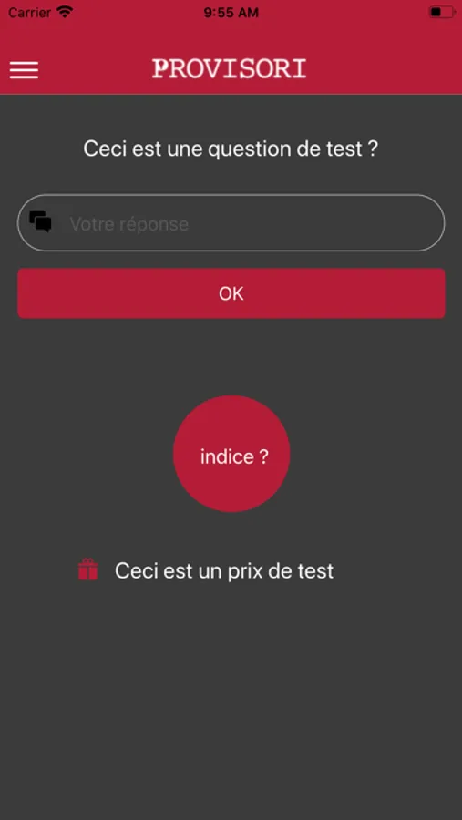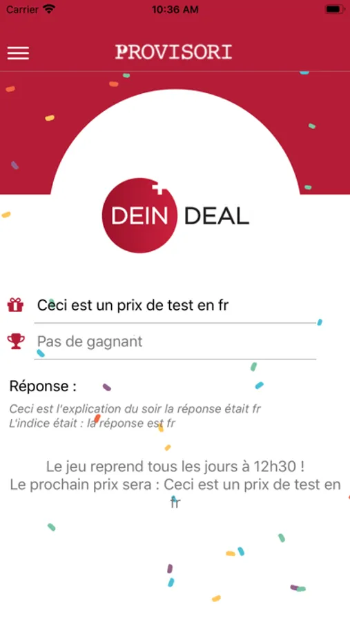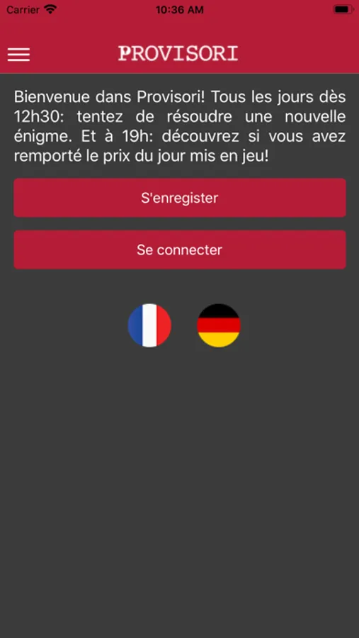 Provisori is a game available as a mobile app. Free and available on the Apple Store, players can take part in a 71-day journey. The premise of the game is the following: each day, a new riddle to solve is released. The first player to enter the correct answer wins a prize. These prizes are offered by participating partners, and can be won every day for the duration of the game. And to maximise your chances of winning, for each riddle a hint is available for purchase.