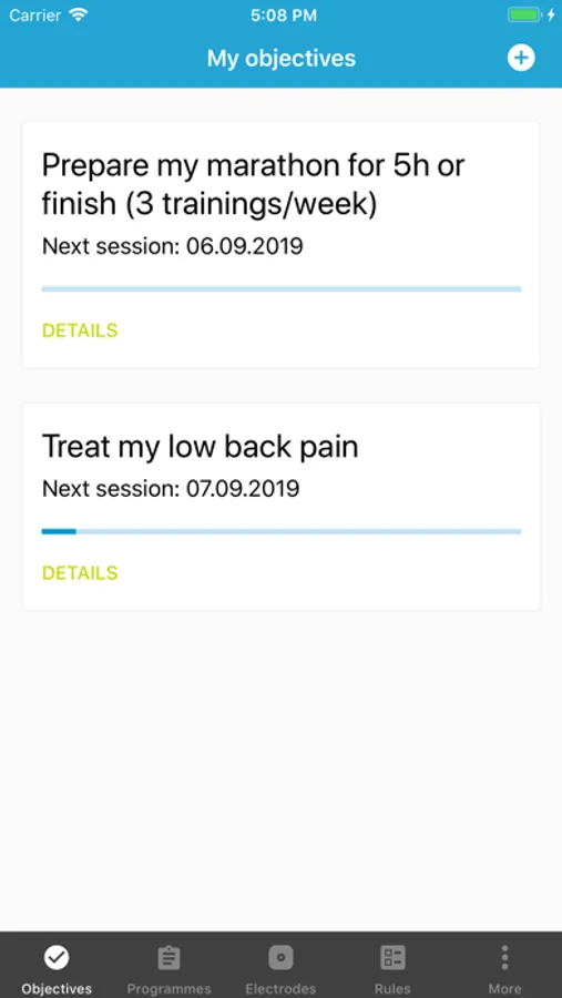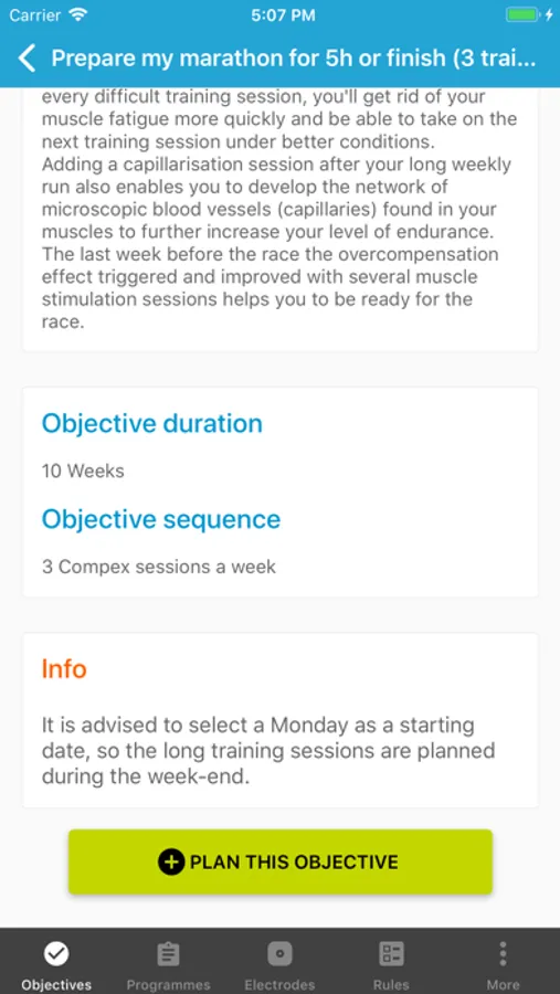 - Find an objective that fits your needs (eg: Prepare for a marathon, triathlon or cycling race, Treat a back pain or tendinopathy, Increase your strength…) and set up the plan to reach it.