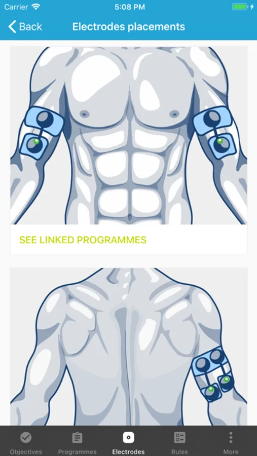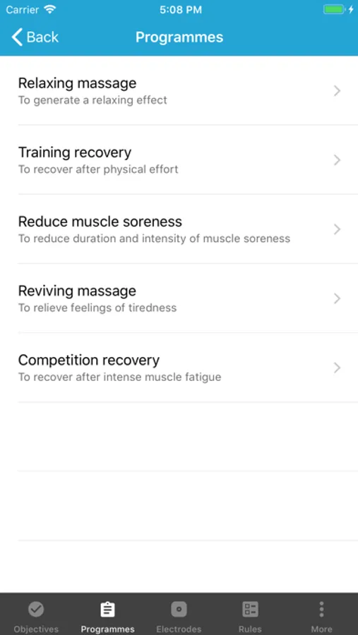 - Provide all the details for each Compex programme (description, usages, effects, stimulation intensity, electrode placements)