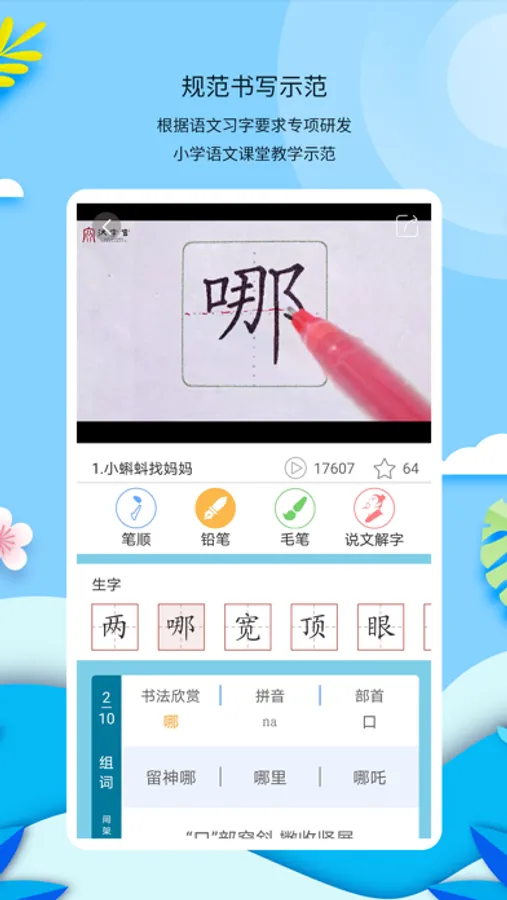二、规范字教学:与语文教材同步,每一个字都有三笔字讲解示范,20000个教学微视频;130000多张古今书法家书法高清欣赏。