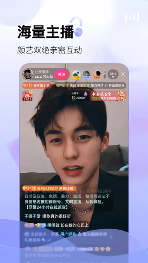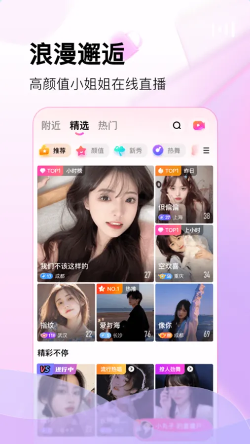 视频互动、赛事pk、精彩活动、酷炫特效礼物,更有动感舞蹈达人秀,超人气实力唱将现场献唱,给你好玩!
