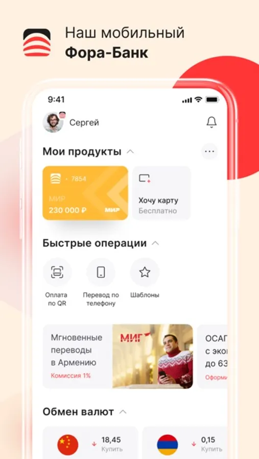 В нашем новом мобильном приложении Фора-онлайн можно быстро и бесплатно переводить деньги по России, осуществлять выгодные переводы за рубеж с сервисом МИГ и Contact, переводить близким и друзьям через СБП, удобно и безопасно пополнять счет из другого банка.