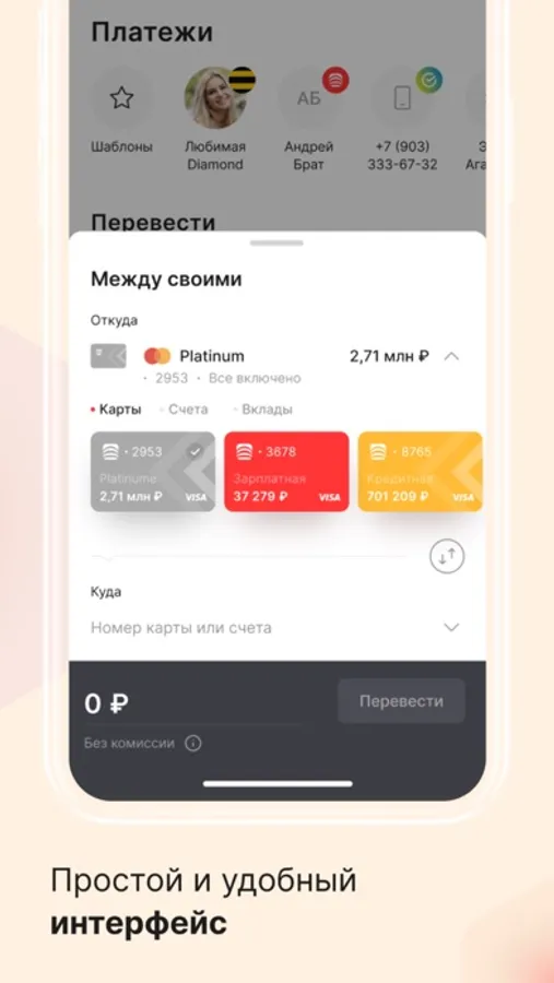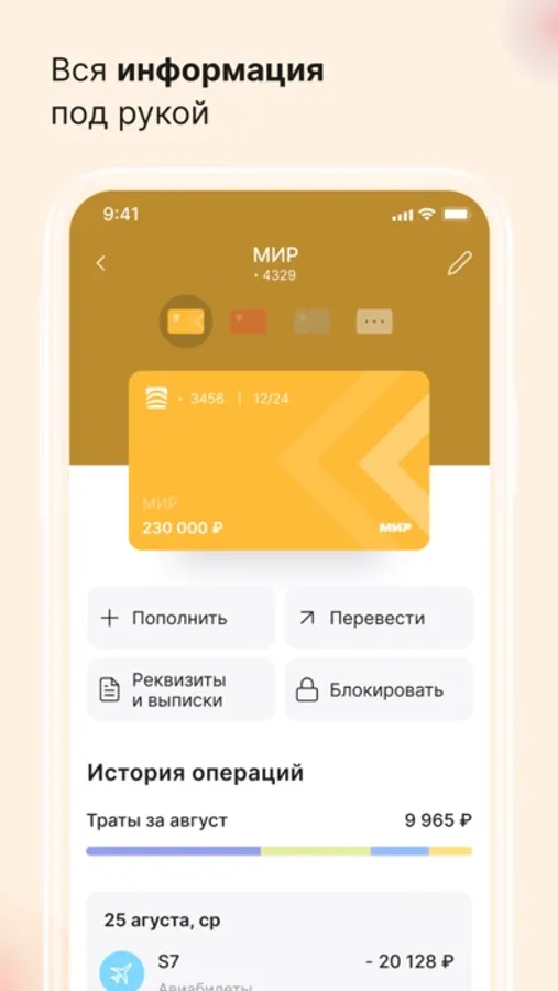 Просматривайте остаток по картам и счетам, а с удобным интерфейсом легко быть в курсе последних операций.