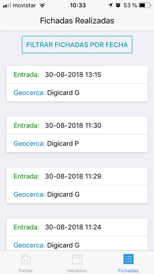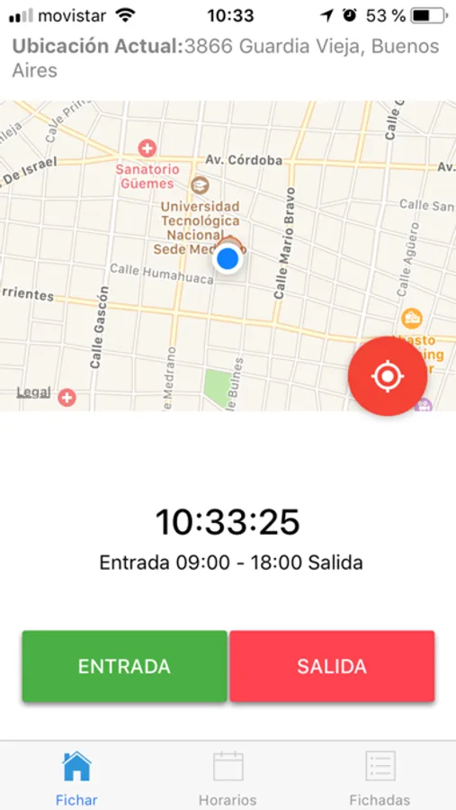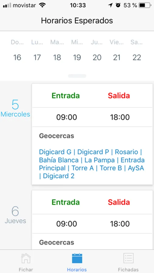 También permite al usuario consultar próximos horarios laborales y un historial de las fichadas realizadas