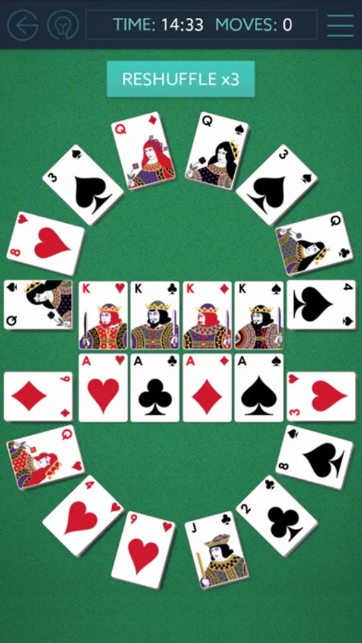 Stack cards of the same suit in ascending order on the aces and descending order on the kings. From kings to aces, and aces to kings, try to contain the chaos of Crescent Solitaire!