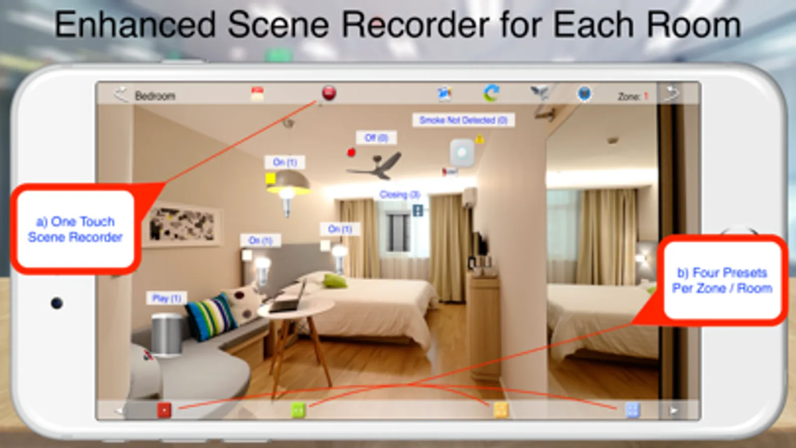 One touch Scene recorder allow you to store 4 presets of all devices together Even from different protocols (for Apple HomeKit, BACnet, KNX) on each zone so it’s like 24 scenes for each room.