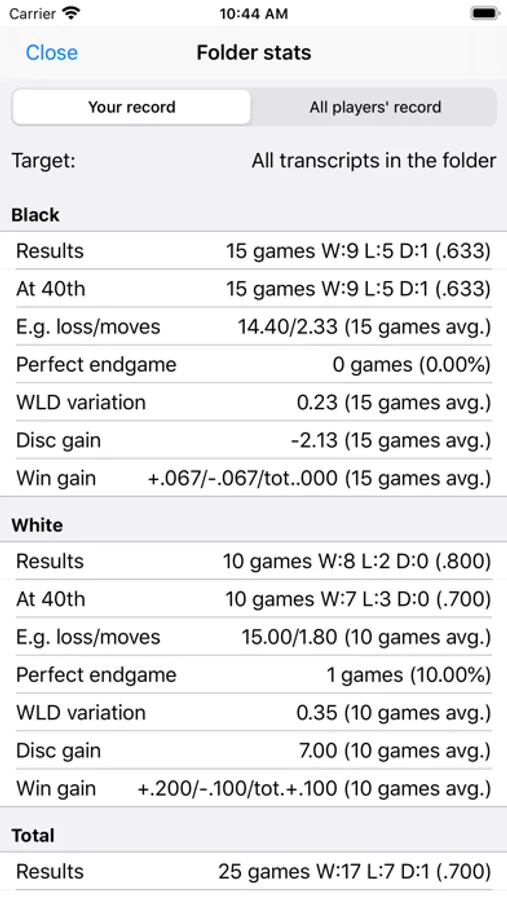 - Stats of win-loss, endgame-loss and various detail items for folder and search result