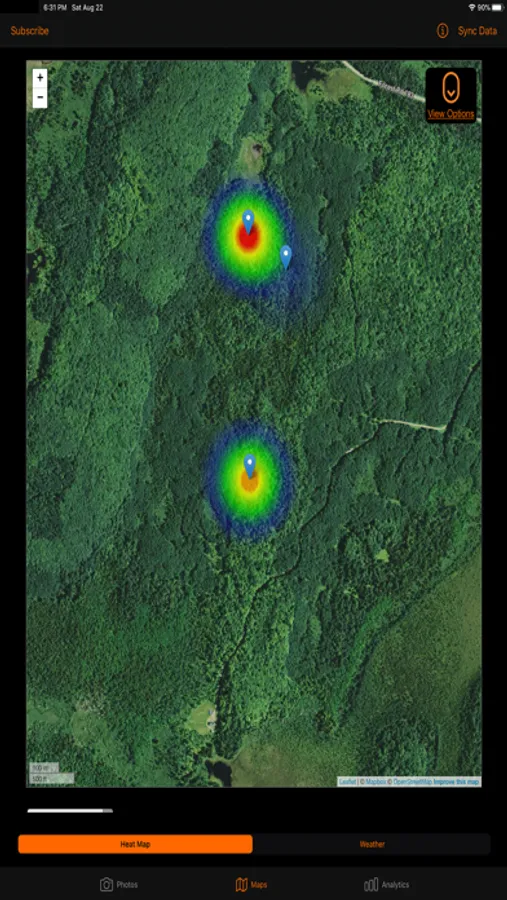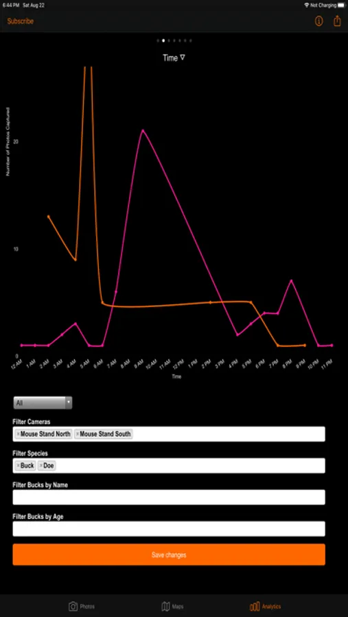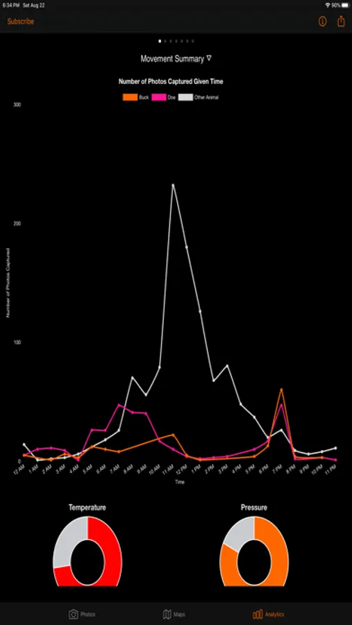 A paid subscription includes access to hunting insights and analytics in the form of Heat Maps, Home Range Maps, Weather Visualizations, and a variety of Charts depicting animal movement based on imported trail camera photos and associated metadata.