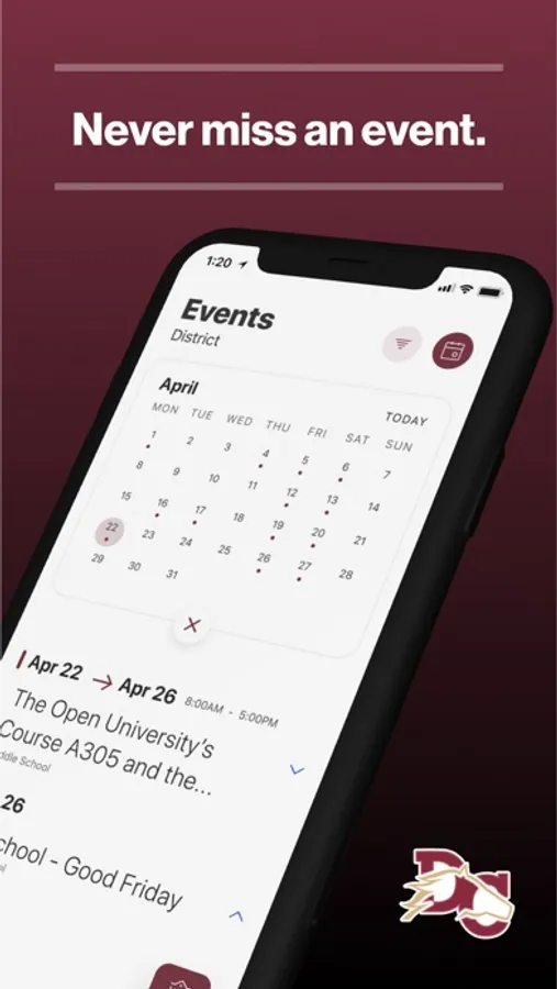 The event section shows a list of events throughout the district. Users can add an event to their calendar to share the event with friends and family with one tap.