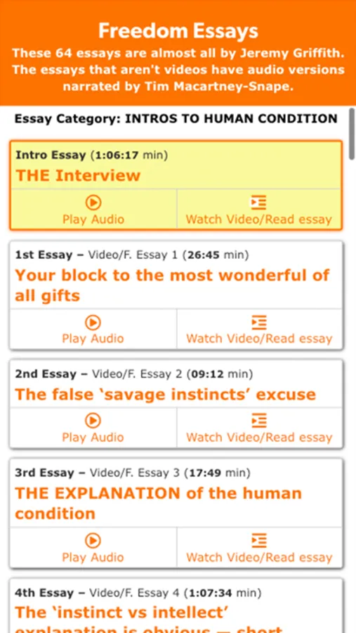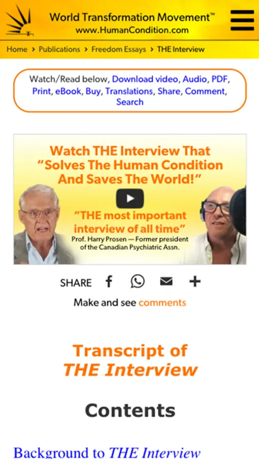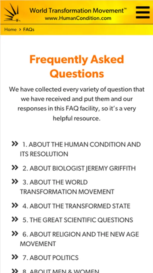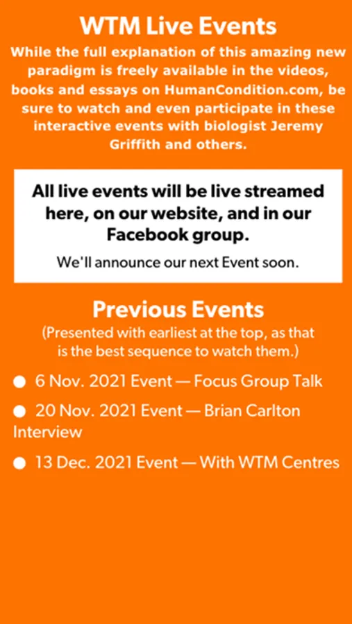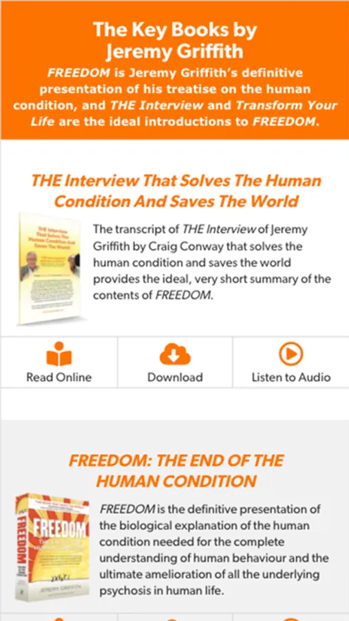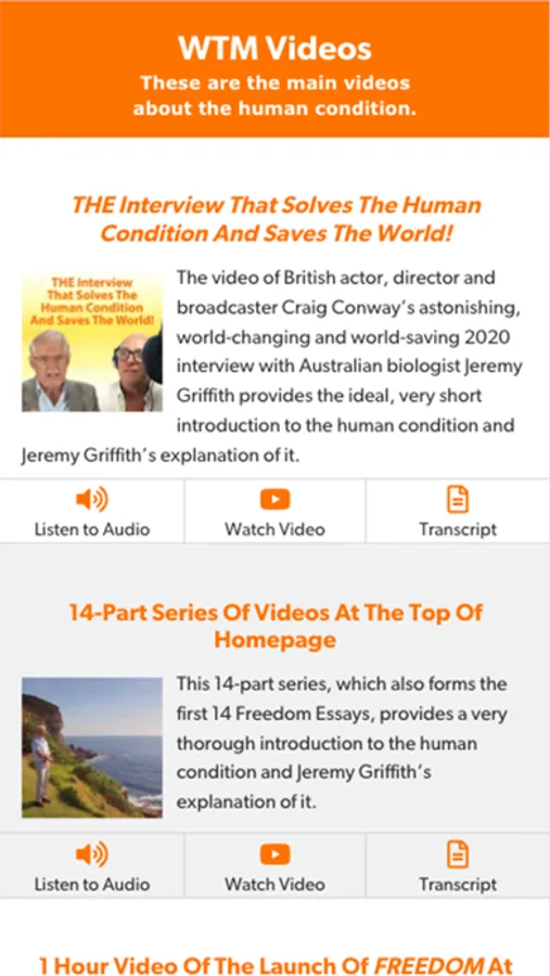 The WTM App offers you easy access to various WTM presentations. These presentations include ‘THE Interview’, which is the ideal introduction to Jeremy Griffith’s treatise; and the Freedom Essay series, which (unless otherwise stated) were written by Jeremy, and cover all the main subjects in his definitive book ‘FREEDOM: The End Of The Human Condition’. The audio versions of the books and essays include audios by Jeremy and others, as well as narration by Tim Macartney-Snape AM OAM, a WTM founding director.