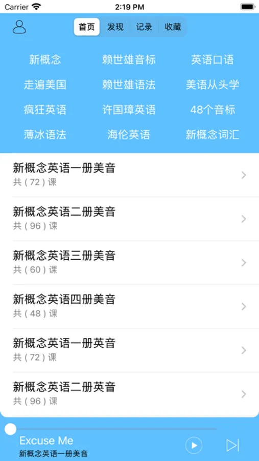 本软件包含:新概念英语,新概念英语英音,新概念英语美音,走遍美国,美国英语教程,赖世雄讲英语,许国璋英语,疯狂英语,英语语法,美语从头学,美式音标,