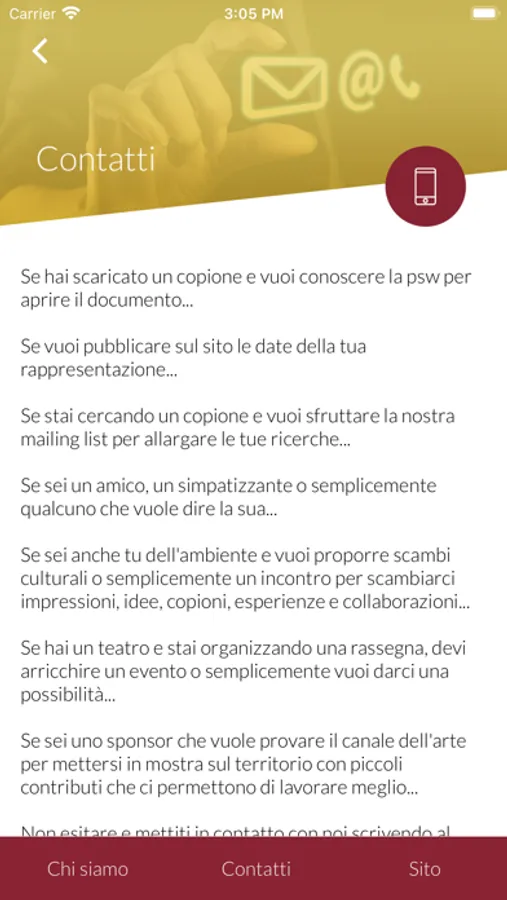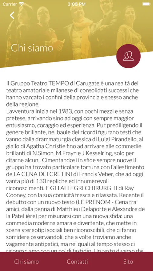 Con questa applicazione è possibile ottenere informazioni sul Gruppo Teatro Tempo, consultarne i copioni anche tramite ricerca dettagliata, e prendere visione delle produzioni in programmazione.