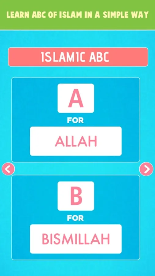 Many educational learning activities such as Islamic games, quizzes, puzzles, Arabic alphabet games, Islamic stories and much more.