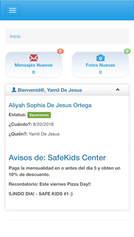 Safe Kids PR es un sistema que permite registrar, electrónicamente, la llegada y salida de su hijo(a) mediante un código individual asignado. El mismo nos permite a nosotros, y a ustedes,saber quién llevo el niño(a) al centro y a qué hora. Si por algún motivo el niño(a) no se ha presentado al centro en su hora de llegada regular, el sistema envía notificaciones automáticas, para notificarles a los padres y darles la oportunidad de avisar si por algún motivo no asistirá al centro ese día. En adición le permite anotar los medicamentos del día y añadir alguna nota particular para ese día.
