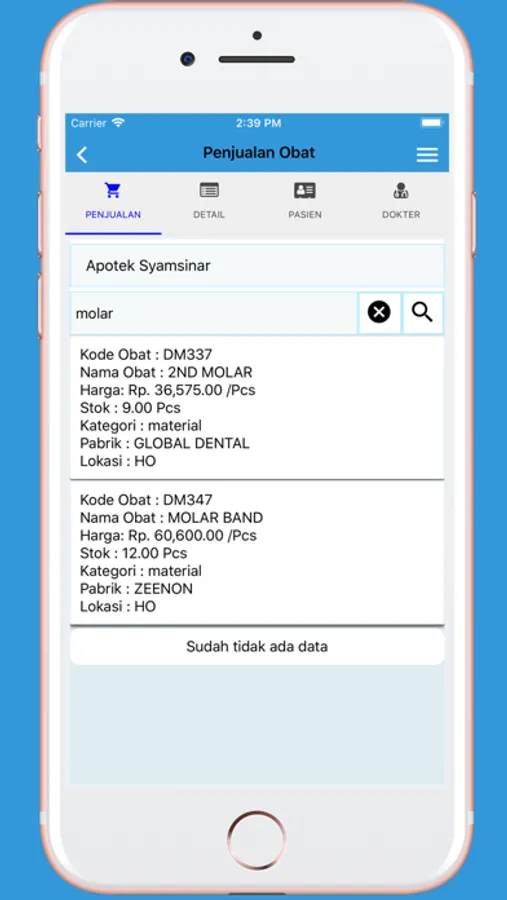Dengan adanya fitur penjualan obat ini maka Apotek Anda bisa melakukan proses penjualan obat umum KAPAN SAJA langsung menggunakan HP / Smartphone Anda. Dan ketika ada pemadaman listrik pun, Apotek Anda masih bisa melanjutkan proses penjualan cukup menggunakan Power Bank tambahan supaya HP / Smartphone nya bisa digunakan lebih lama untuk melanjutkan pelayanan ke pelanggan. Jadi tidak perlu khawatir lagi jika di Apotek Anda masih sering terkendala pemadaman listrik, cukup menyediakan HP / Smartphone dan Power Bank saja.