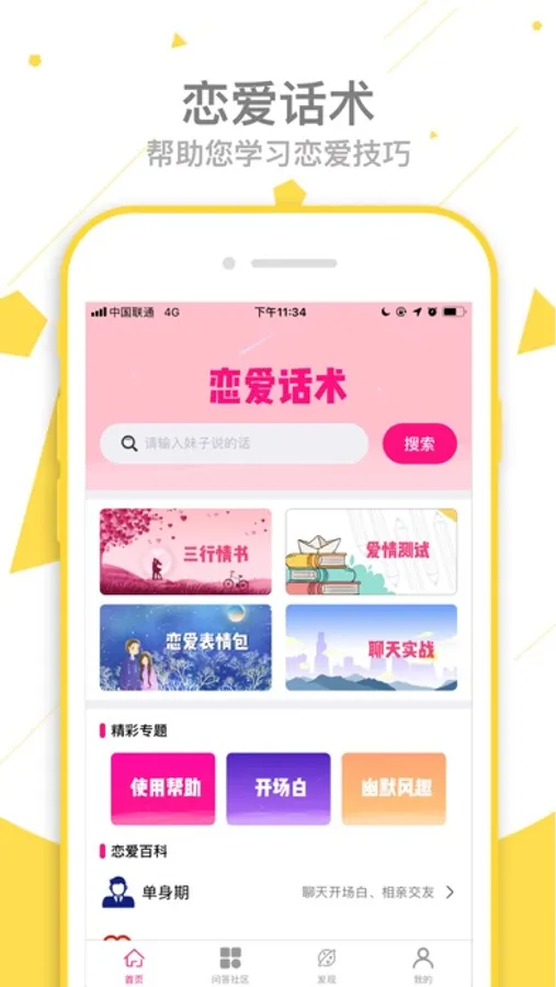 恋爱话术,一款可以帮你解决以上烦恼的App,10W+话术库,遇到不知道怎么回复女生时,来这里搜一下,N+精彩回复供您选择,让您和女生聊天不再烦恼,更有问答社区和网友们共同交流。