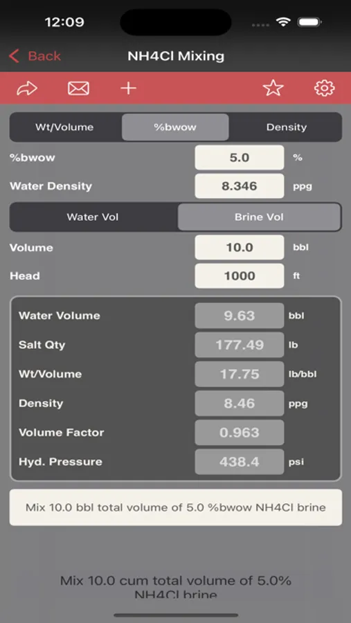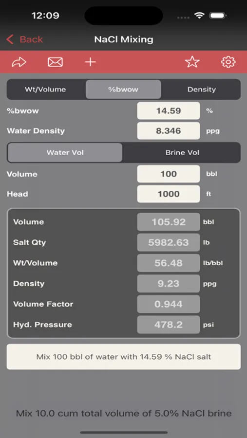 The calculators also, provide the quantities required based on known density or concentration of brine in terms of %bwow, wt/vol of water and volume factor.