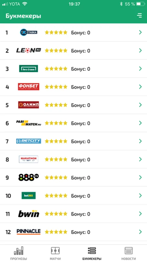 В программе можно найти информацию, рейтинги и прогнозы на спорт. Делать ставки (bet) не получится, но зато можно отслеживать информацию таких БК (букмекерских контор):