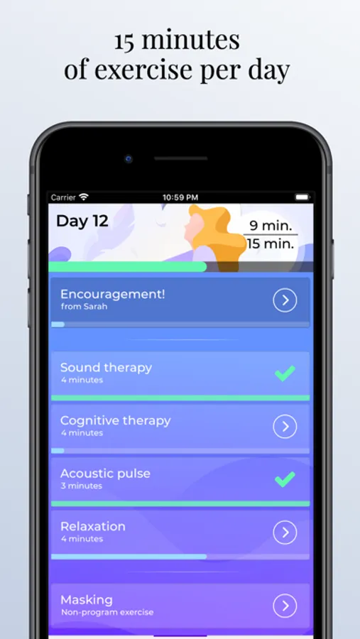 Diapason is designed to get you from suffering from tinnitus, to being able to manage it peacefully on a day-to-day basis. To achieve this over the course of a few months, we turn state-of-the-art methods for tinnitus management into motivating and intuitive therapeutic activities. Each session in Diapason will get you through a handful of these activities, highly personalized to your specific profile & needs.