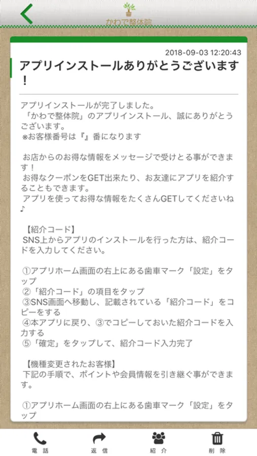 かわで整体院のアプリをSNSを通じてお友達に紹介する事ができます。