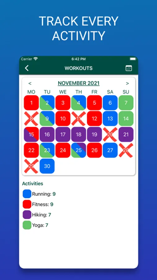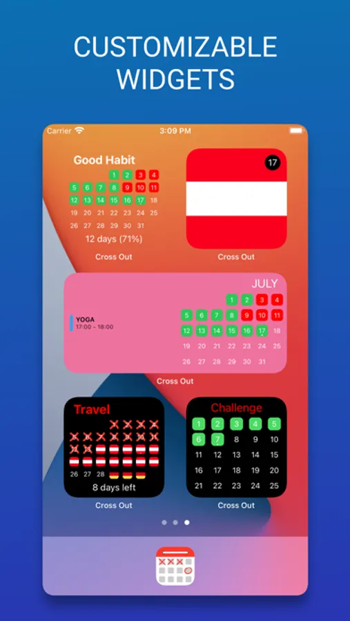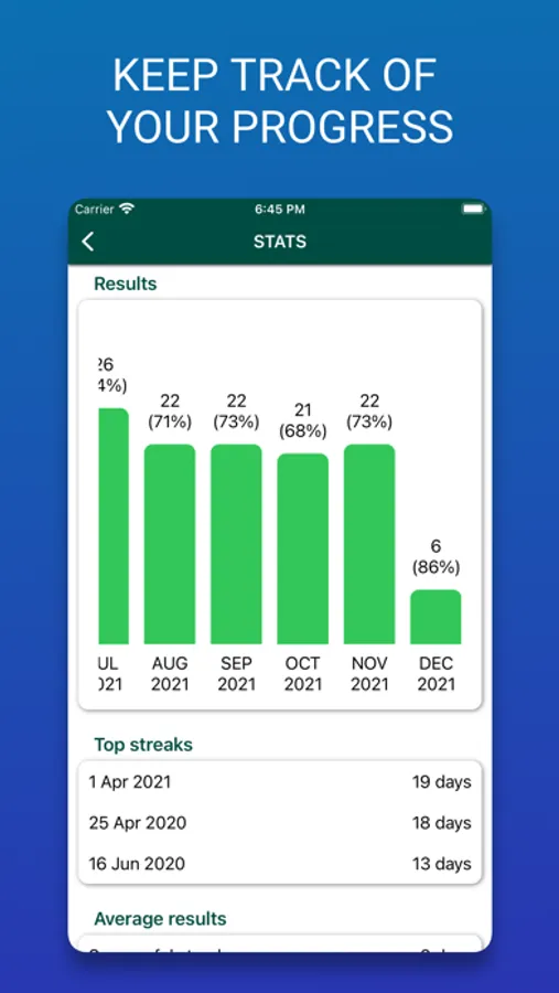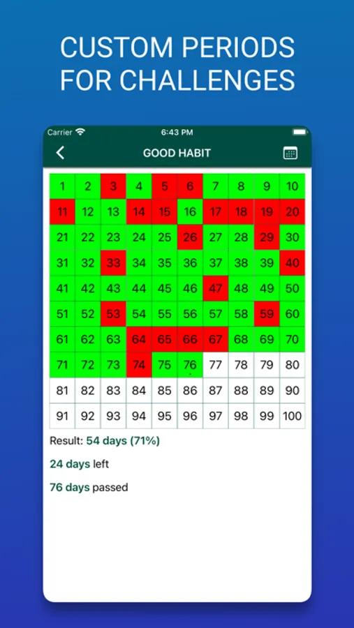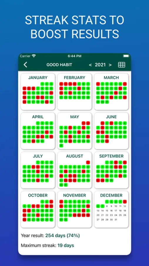 - Current streak, monthly results and maximum streak labels will help you to build new habits and to not break the chain