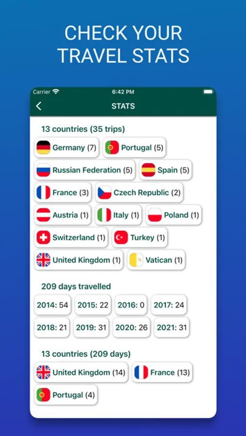 - Export a PDF monthly/yearly reports with a total number of days you spent in each country, which is useful for tax and legal purposes
