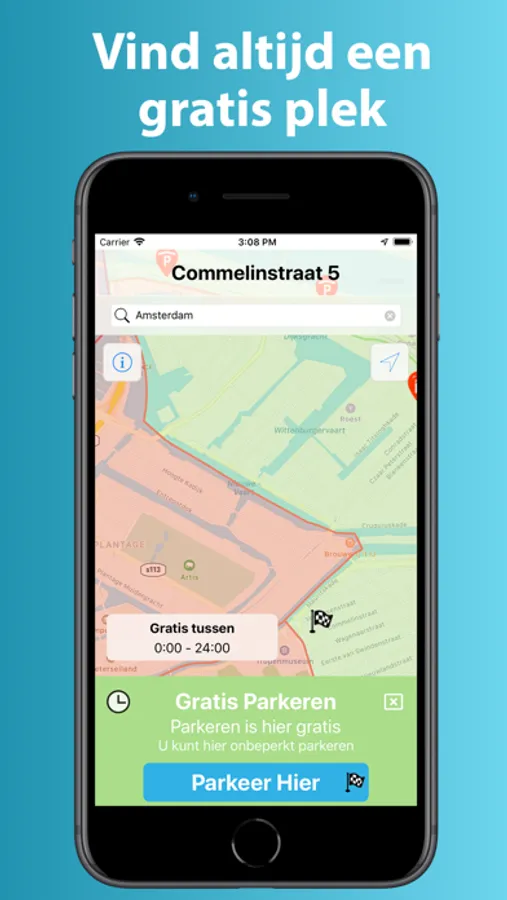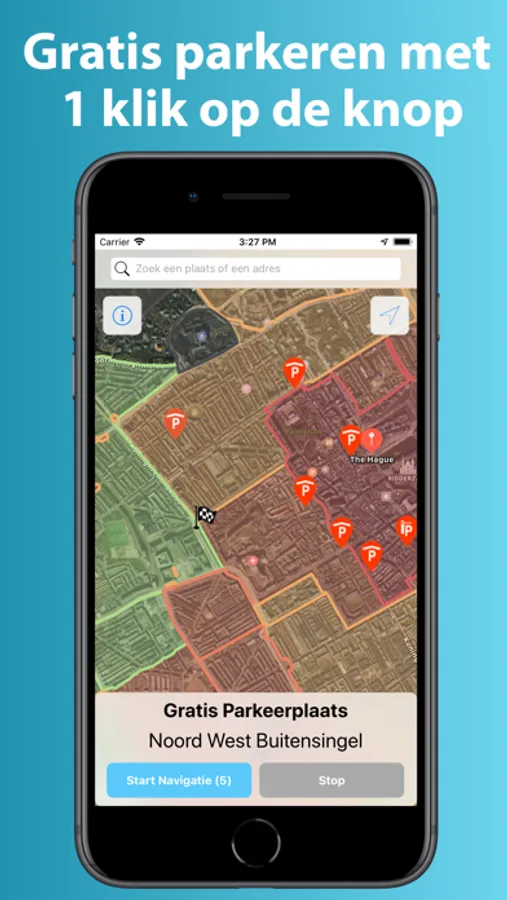 • Parky zoekt voor u de dichtstbijzijnde gratis parkeerplek met 1 klik op de knop.