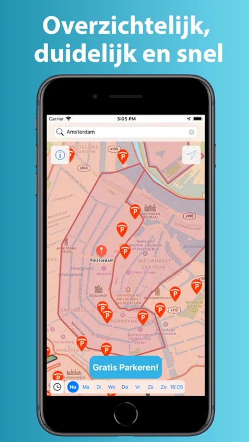 • Kies gemakkelijk de dag en tijd waarvan u de parkeermogelijkheden en tarieven wilt zien.