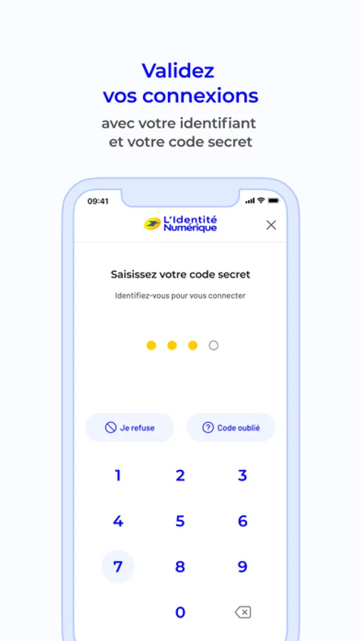L'Identité Numérique La Poste repose sur la combinaison unique de votre identifiant, votre application mobile et votre code secret. Cette procédure d'authentification forte permet de garantir vos accès en s'assurant que c'est bien vous qui êtes à l'origine de la demande de connexion. Avec La Poste, L'Identité Numérique c'est plus simple, plus sûre et plus pratique.