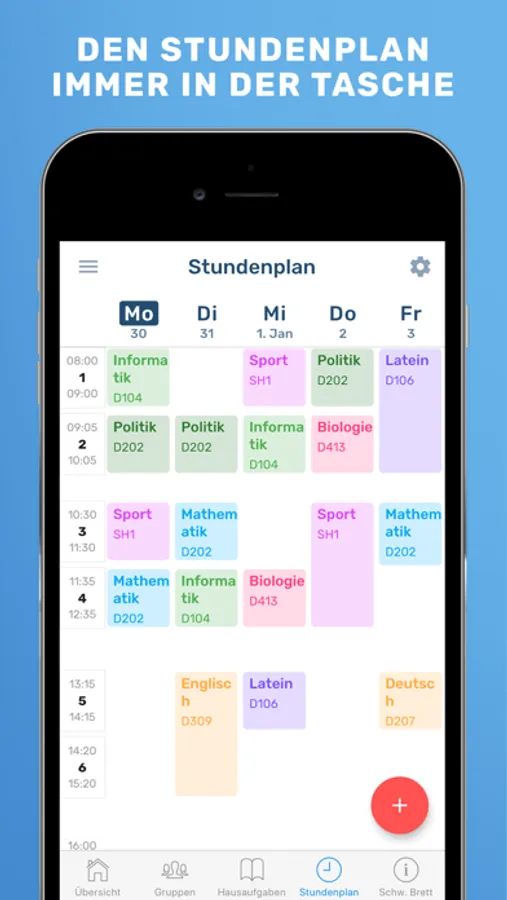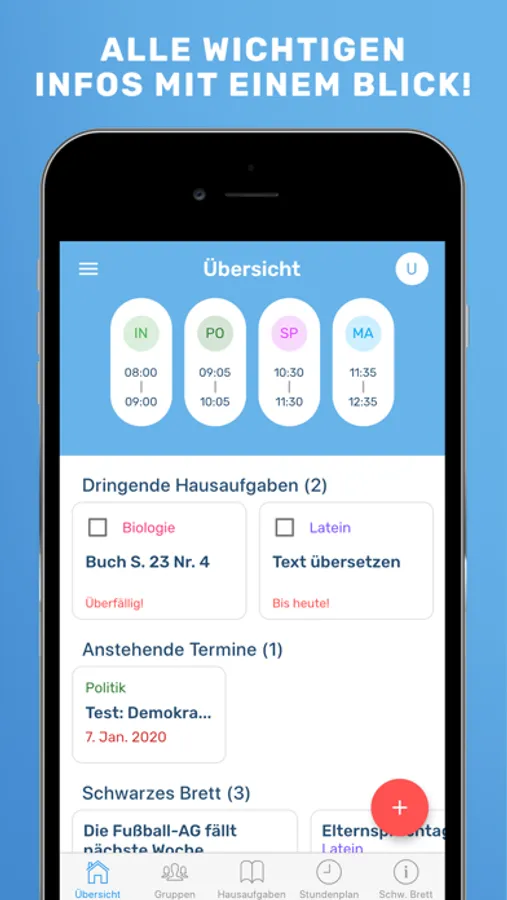 Übersicht: Auf der Übersichtsseite hast du deinen Schulplaner perfekt im Blick. Hier siehst du alle dringende Hausaufgaben, den heutigen Stundenplan, anstehende Termine, offene Infozettel und vieles mehr.
