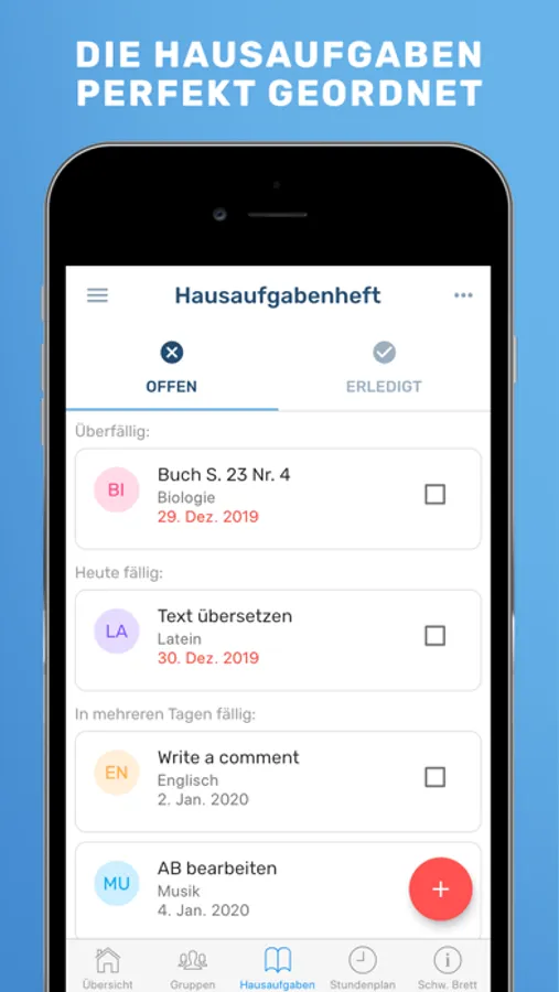 Benachrichtigungen: Durch die Erinnerungen vergisst du nie wieder die Hausaufgaben aus dem Hausaufgabenheft. Am Vortag erhältst du eine Erinnerung für alle offenen Hausaufgaben.