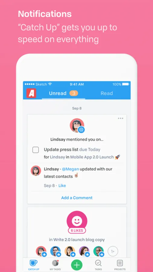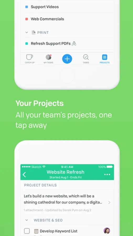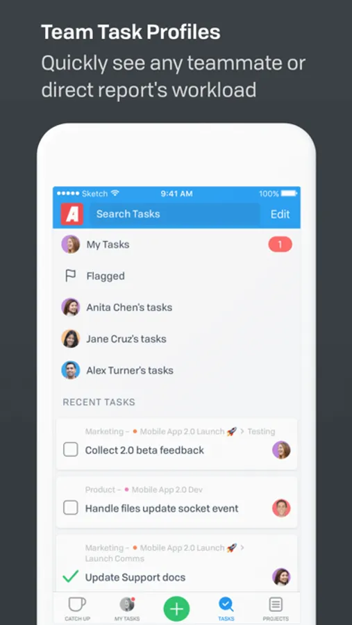 • Stay up to date. Track activity across your company and be notified about the projects, tasks, and conversations you’re working on or following.