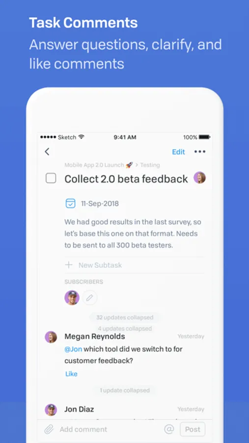• Share your thoughts. Comment on tasks from anywhere to clarify instructions, add details, or ask questions.