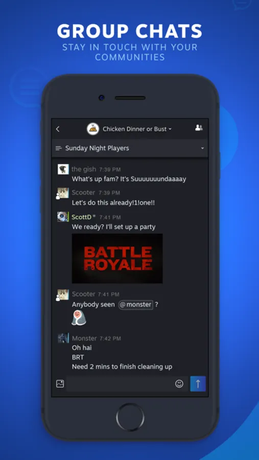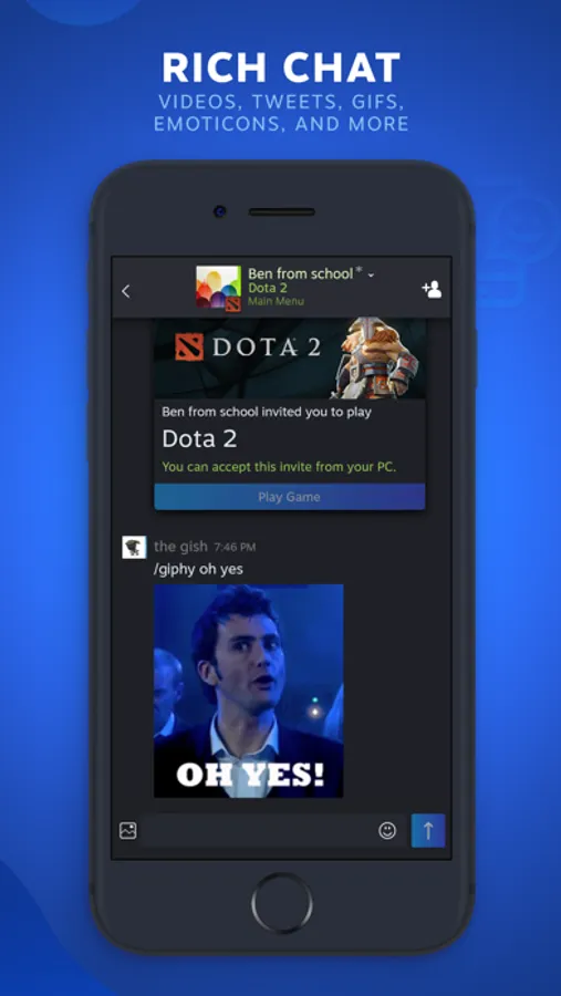 The Steam Chat app includes many key features of the desktop Steam client chat, including: