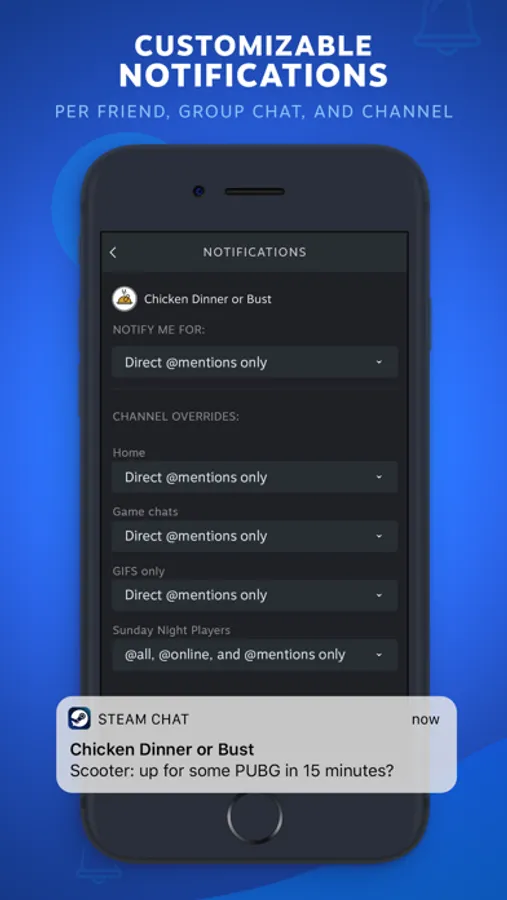 Customizable Notifications – Mobile notifications mean you'll never miss a message or game invite. You can customize your notifications per friend, group chat, and chat channel.