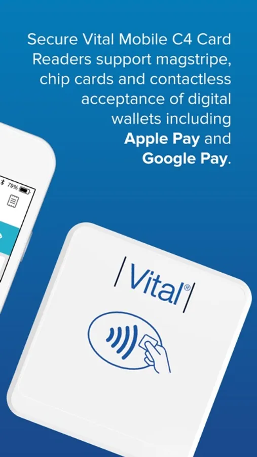 Vital Mobile is an easy-to-use, point-of-sale App that allows you to run your business and accept customer payments - anytime, anywhere. With Vital Mobile, you can accept and track all of your customer payments. Paired with the Vital C4 Card Reader, Vital Mobile securely accepts all major credit and signature cards whether they are swiped, dipped or contactless tap and go. This includes payment acceptance from most digital wallets such as Apple Pay and Google Pay.