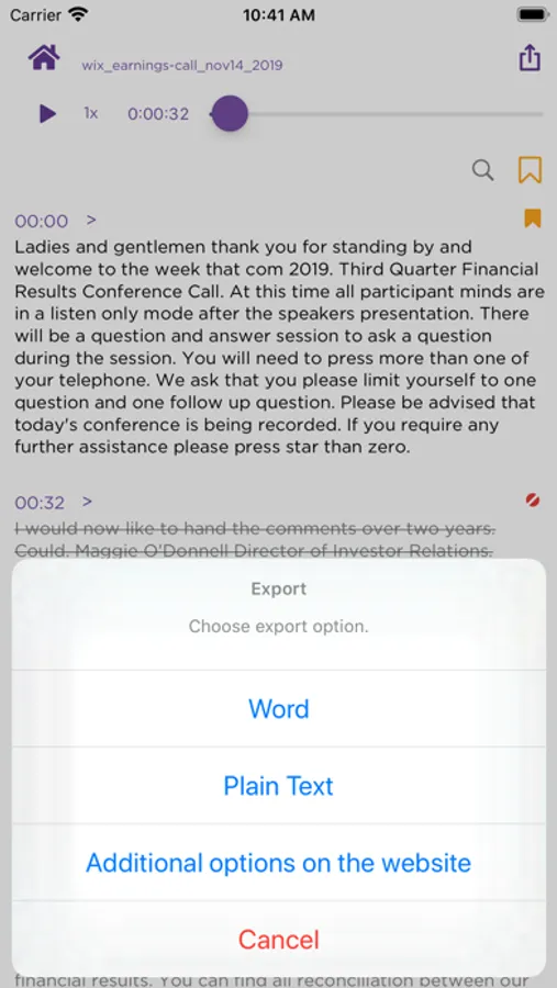-export the transcript to Word, text, and a plethora of other formats