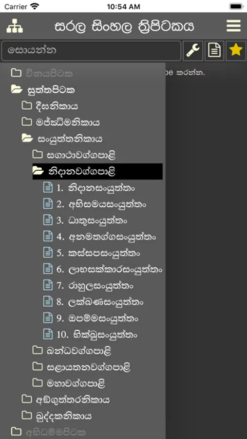 Sutta list in a tree view and the Pali Sinhala Dictionary can be accessed by clicking on the menu.